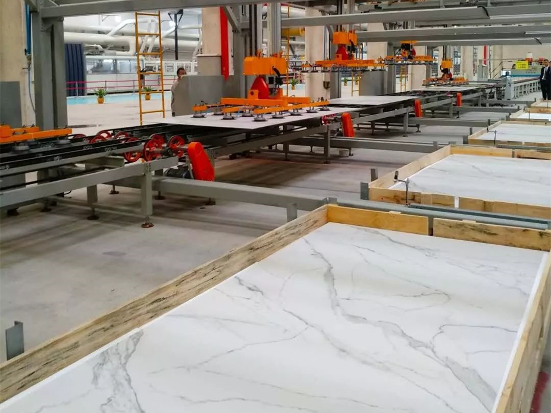 祥达企业的岩板生产线于2019年9月新建。该企业的生产线设备大量来自意大利的陶机公司,例如压机采用的是意大利SACMI的38000吨连续辊压机,同时还引进了意大利LB布料机、意大利BMR的智能抛光线,据说还斥巨资配置了意大利SACMI的大规格喷墨印花机,号称是国内岩板生产线的顶配。在窑炉的选择上,祥达企业岩板生产线选用的是佛山本土的瑞陶窑炉。从祥达企业建岩板生产线时设备选用的“荤素搭配”来看,必定是有自己的一套窍门,其岩板产品性价比也让其他岩板企业始料未及。