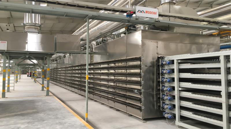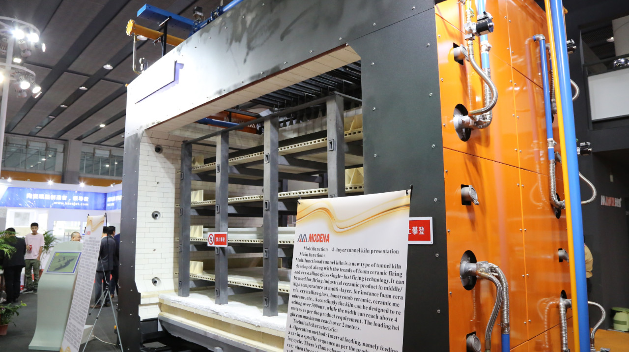 摩德娜“多层窑”:陶瓷岩板对窑炉的传动设计及安装精度要求特别高,摩德娜采用DRI传动系统设计,SKF进口轴承的应用,单电机独立通轴设计,减少轴的连接。摩德娜在将军企业投产的MDS双层窑炉,占地面积只有传统单层窑的一半;比单层窑节省燃耗5%以上;再通过优化管路设计和合理选型、采用新型节能烧嘴、纳米保温材料和余热的综合利用,双层窑综合节能可达15%以上。同时摩德娜还是是首家研发七层干燥的公司,亚洲第一条采用摩德娜七层干燥窑的岩板线,于2018年初在印度LIOLI公司投入使用。