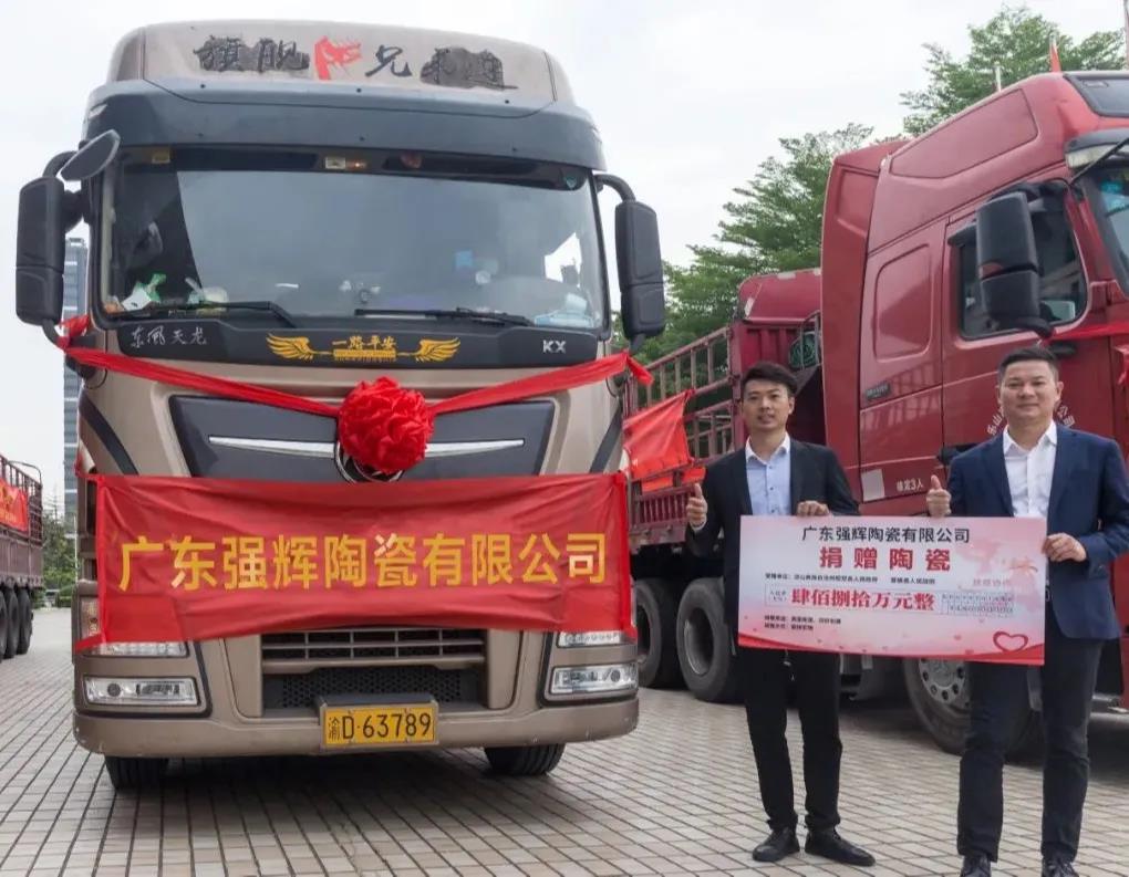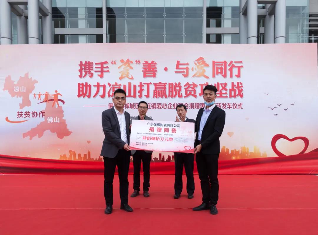 2020年4月13日,强辉精工瓷砖砖积极响应国家“坚定不移打赢脱贫攻坚战”号召,发挥自身产业优势,在【携手“瓷”善 · 与爱同行  助力凉山打赢脱贫攻坚战】佛山市禅城区南庄镇爱心企业联合捐赠惠民瓷砖发车仪式上捐赠价值480万元瓷砖,为带动四川凉山地区发展,走上脱贫致富之路贡献出一份力量。