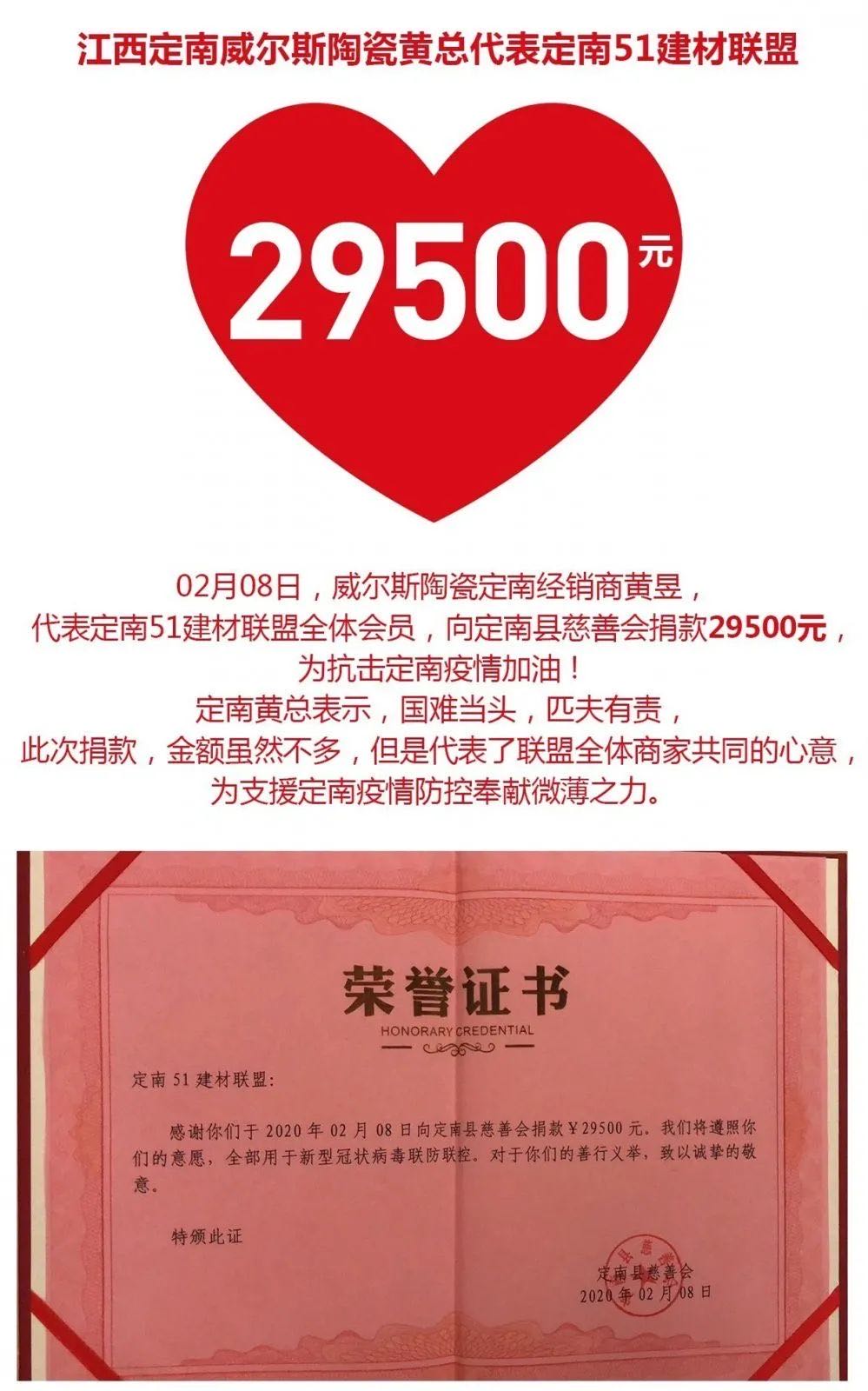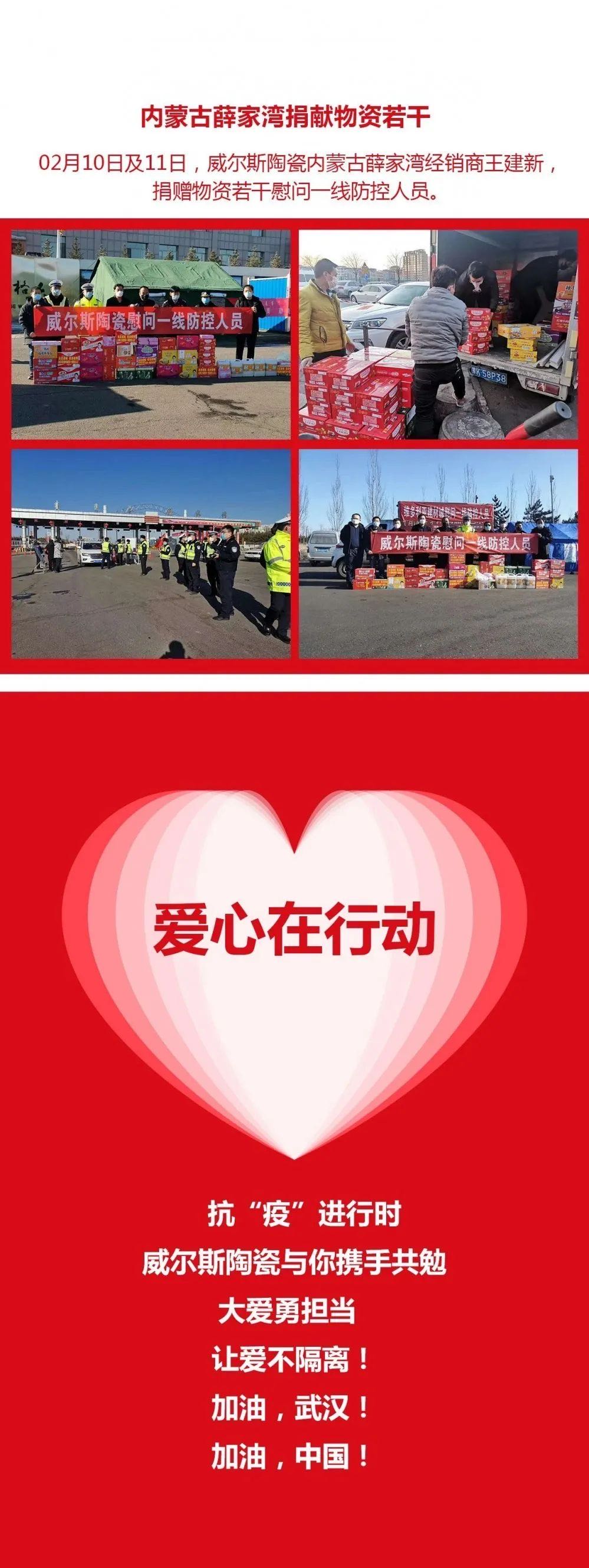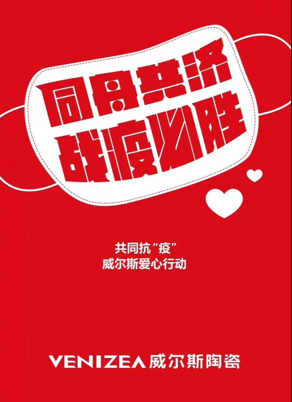 今年以来,新冠疫情牵动着全国人民的心。在疫情最为紧张的时候,疫情就是命令,防控就是责任!威尔斯陶瓷作为一个行业领先的陶瓷品牌,时刻关注着疫情的动态,义无反顾地投身抗疫大军。众志成城,同舟共济,威尔斯陶瓷厂商携手,助力祖国和人民战胜疫情。