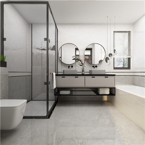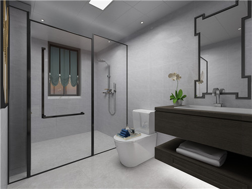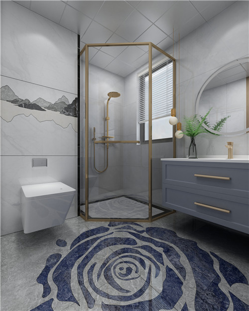 蓝色拼花与灰色地砖搭配出来的卫浴间,让高雅的空间多了一份高贵,瞬间提升整个空间的格调。蓝色的背景墙砖与白色相间,在整体灰色调的空间中,成为点睛之笔,为朴素的空间增添了一份高贵的灵气。