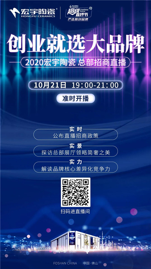 创业就选大品牌。2020宏宇陶瓷,总部招商直播再次来袭!