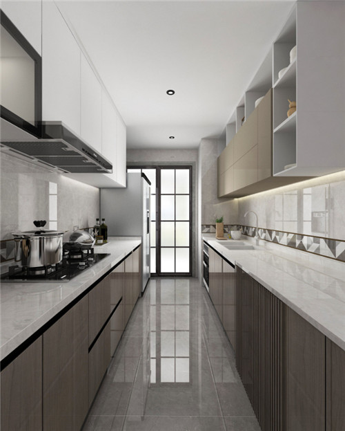 现代风格的厨房装修,讲究的是简洁、实用。下面的这个厨房案例就诠释了这个装修的意义。在下面的案例中,整个厨房只是留有中间的走道,对于我们经常做饭的人来说,这还是很实在的,在一边洗菜、切菜,另一边可以直接煮东西,两边都不耽搁。在整体的装修上也是较为大气的,对于小户型来说,很多时候装修都会烦恼厨房的装修,又想实用又想美观,其实不妨尝试一下现代风格。