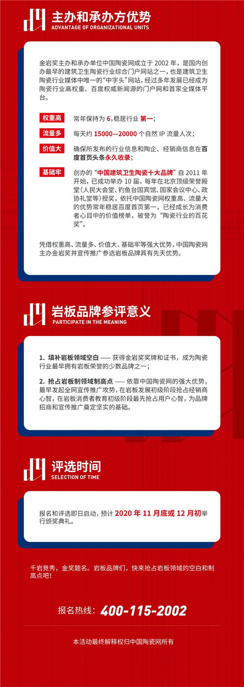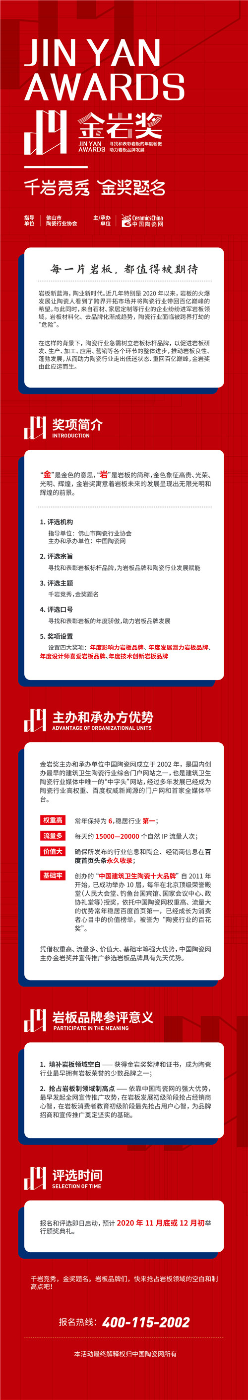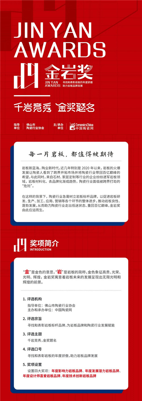 在这样的背景下,陶瓷行业急需树立岩板标杆品牌,以促进岩板研发、生产、加工、应用、营销等各个环节的整体进步,推动岩板良性、蓬勃发展,从而助力陶瓷行业走出低迷状态、重回百亿巅峰,金岩奖由此应运而生。