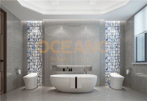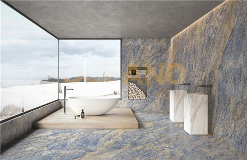 上面这个案例大胆地运用了苏格·岩板石系列青丘彼岸,以梦幻蓝色为主的幻彩版面,将传说的神秘感与唯美感营造出来,使整个卫浴间变得与众不同。设计师通过墙地一体化的设计,打破设计边界,让空间无限延伸。