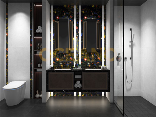 时尚的现代简约卫生间,强调的是去繁留简,常见的线条和简单图案的交织便能将卫生间个性展现出来。就像上面这个案例,设计师巧妙地把带有花朵图案的卡汀2代玄青逗彩来装饰卫浴间的隔断,不破坏“简”之余还打破了空间的沉闷感。