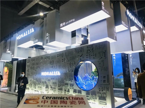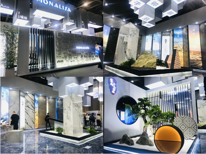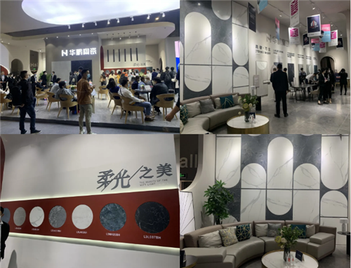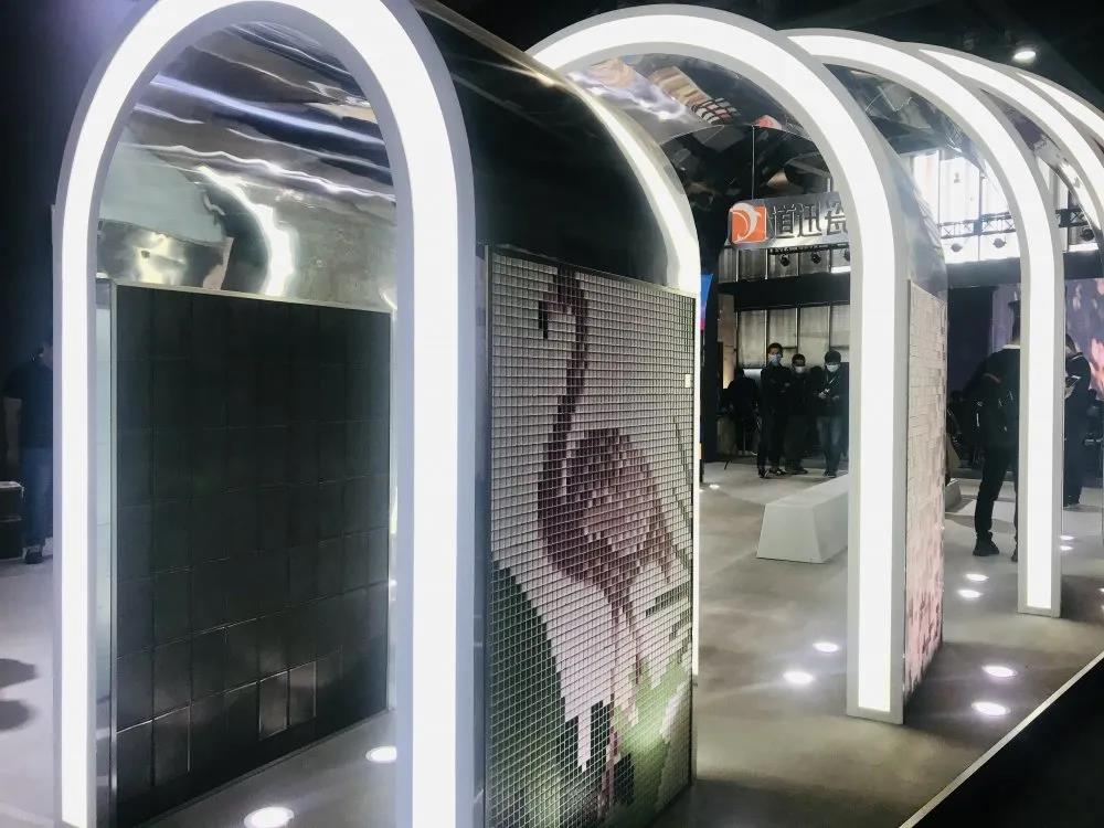 以29°柔光砖为主打产品的华鹏陶瓷,此次以“柔光之美”为主题,继续多维度地向大众展示柔之美。展位设计运用了弧形元素,圆弧型的拼接瓷砖少了直线条的硬挺,多了柔和的灵动感;温莎城堡灰、云灰石、爱马仕大象灰等低饱和度高级灰色系瓷砖为展馆增添了舒适雅致的高级感;展位正面以开放式的休闲洽谈区为往来客商提供小憩之地,体贴的设计正如29°柔光砖,细腻温润,关照生活细微的感受。