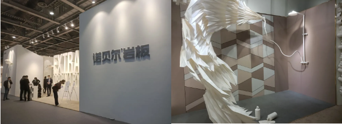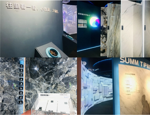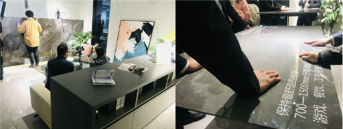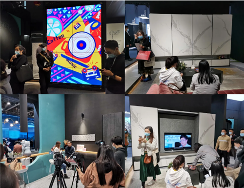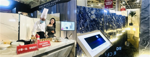 博德精工砖此次参展主要展示的晶刚玉•独体煅造石材产品,为了诠释“是纸醉金迷,还是回归本色”的主题,展位的沉浸式体验方式结合了视觉艺术、空间设计、光线等多种艺术方式,重塑新的空间理念。另外,展位上除了有“岩”值产品之外,还有美食与美女,号称米其林星级主厨与美女主播一并在现场作报道。