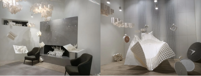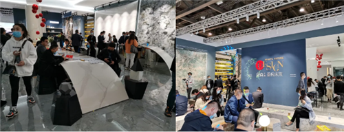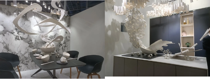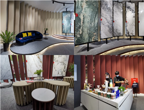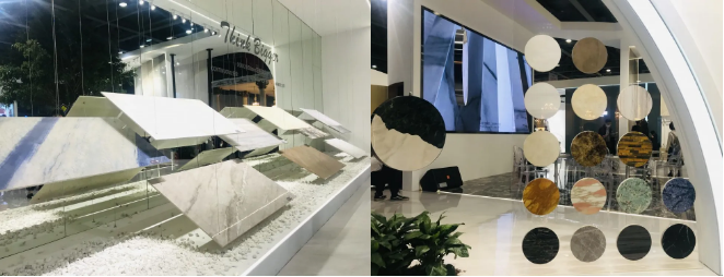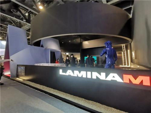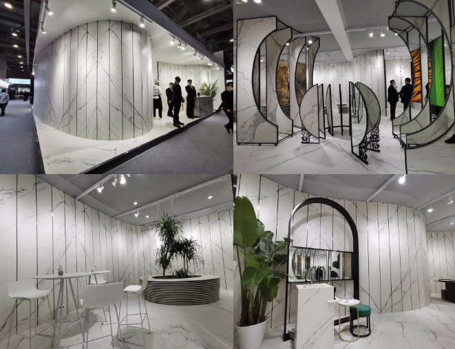 其展位以兼具“直面”与“曲面”的岩板组合出无穷的空间表达语汇,于“曲直”之间重构未来设计与美好生活;以曲直面设计对未来建筑空间设计材料美学致敬,更着重强调产品本身几何面的物理特性和场所精神,与当代建筑及室内空间曲直面组合的设计趋势并肩前行。