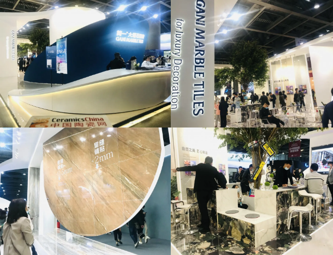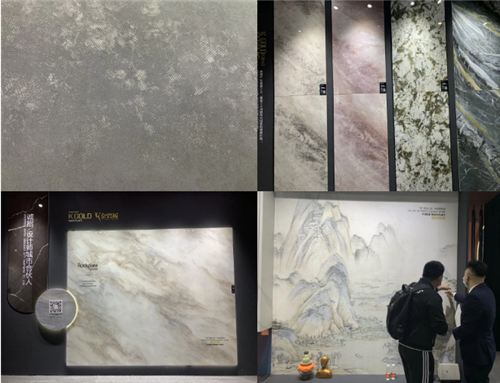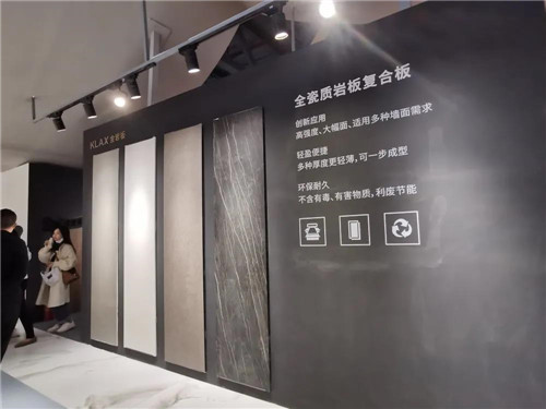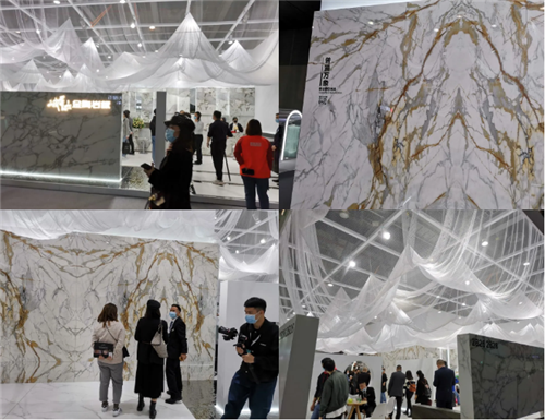 金丝玉玛K金岩板自第35届佛山陶博会期间重榜发布后,首次亮相线下展会。金丝玉玛瓷砖展位以高调的橘红色外立面“先声夺人”,主要展示K金岩板成品家具,如橱柜、酒柜、台面、餐桌、背景墙等。电光釉+闪光粉+金元素等多种核心独创工艺的相互叠加,使得K金岩板在岩板领域极具差异化竞争力,吸引了众多观展商观赏咨询。展位上还展示了部分K金4.0系列产品,亮眼的纹理色调令人惊艳不已。