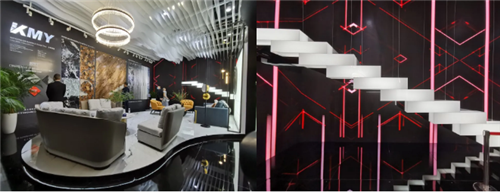 KMY国际轻奢瓷砖展馆名称为奢度°国际馆,从色的斑斓里,发现灵感之源。展位现场将进行时尚秀、现代舞、音乐荟、设计沙龙、茶点品味等活动,设计师可共同探索艺术的本质,把握美学的尺度。每一个细节,都彰显出卡米亚瓷砖的国际视野以及轻奢有度的调性。