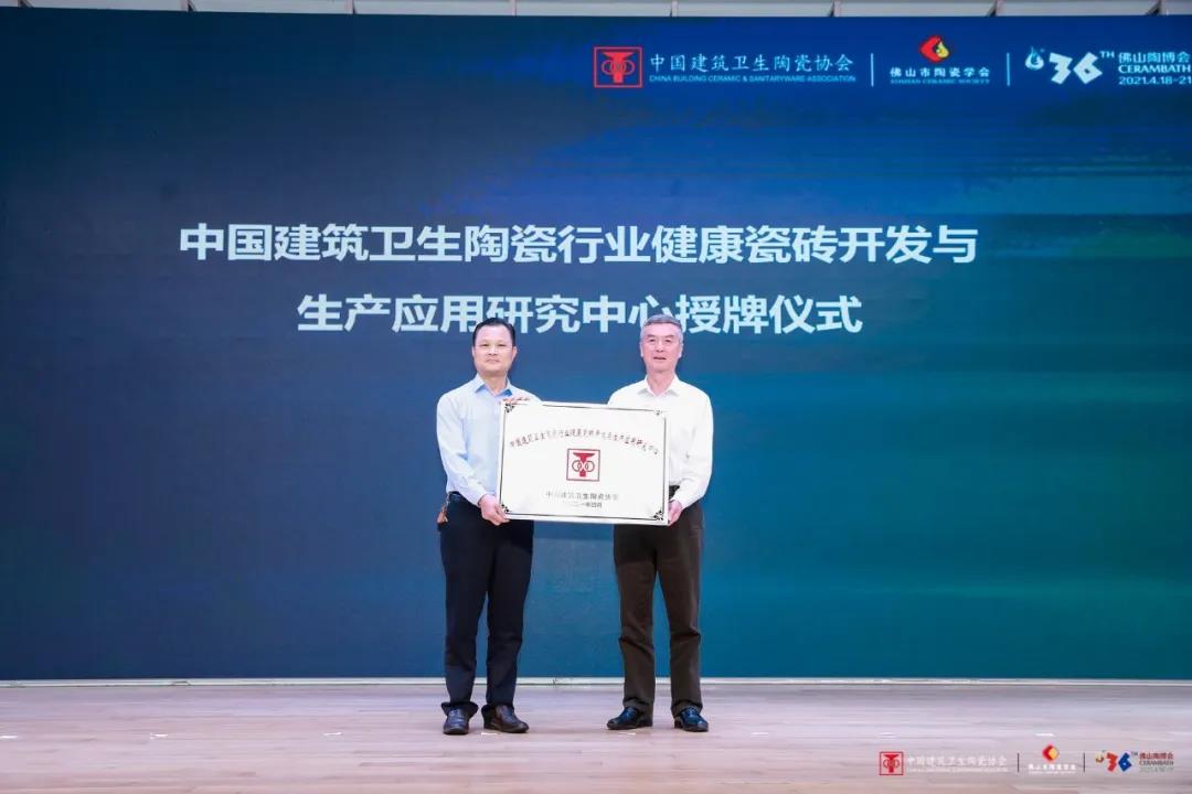 现场还举行了中国建筑卫生陶瓷行业健康瓷砖开发与生产应用研究中心授牌仪式,广东东鹏控股股份有限公司执行董事、创新中心总经理钟保民接受了缪斌会长的授牌。