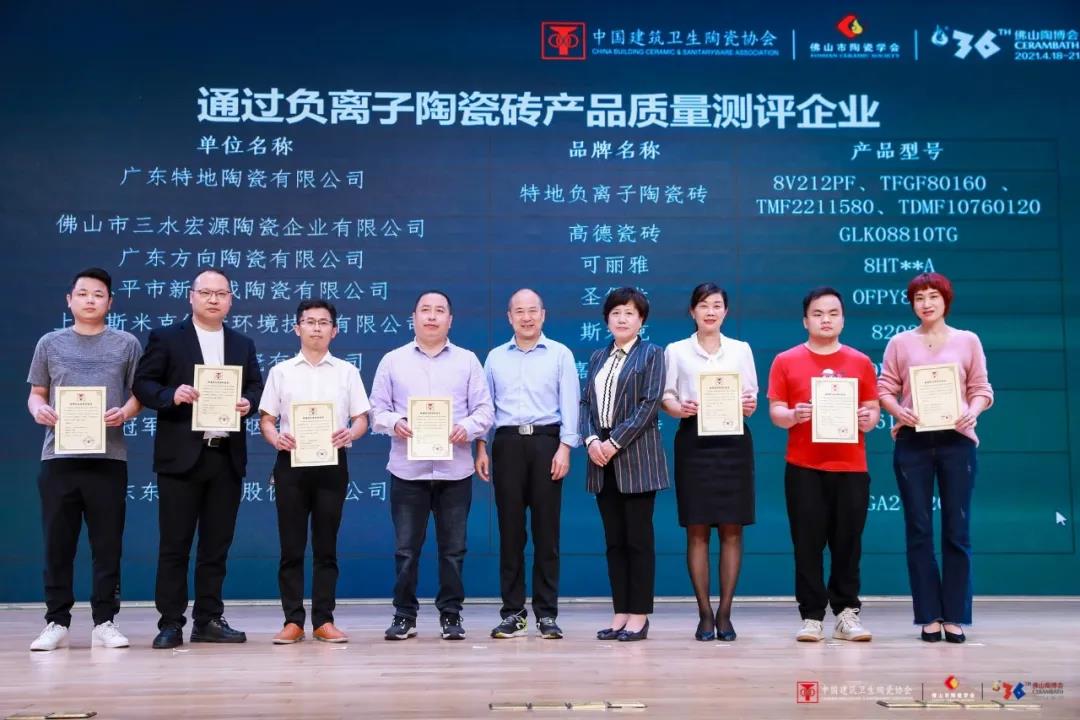 会上还举行了证书颁发仪式,中国建筑卫生陶瓷协会常务副会长吕琴、佛山市陶瓷学会执行理事长徐平共同为首批通过负离子陶瓷砖产品质量测评的企业颁发了测评合格证书。
