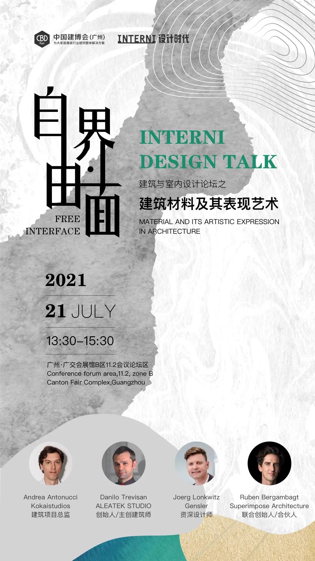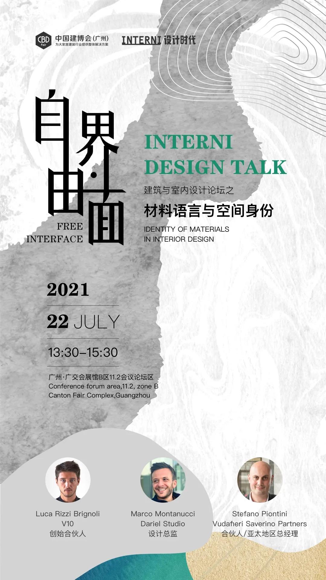 本次,《INTERNI设计时代》国际设计论坛IP活动“INTERNI DESIGN TALK”将落地中国建博会(广州),以“自由界面”为 主题,开展两场建筑与室内设计论坛,我们邀请到了ALEATEK STUDIO创始人/主创建筑师Danilo Trevisan、Kokaistudios的建筑项目总监Andrea Antonucci、Superimpose Architecture联合创始人/合伙人Ruben Bergambagt、V10创始合伙人Luca Rizzi Brignoli、Dariel Studio设计总监Marco Montanucci、Vudafieri Saverino Partners合伙人/亚太地区总经理Stefano Piontini、Gensler资深设计师Joerg Lonkwitz等国际设计师们探讨新材料相关的话题。
