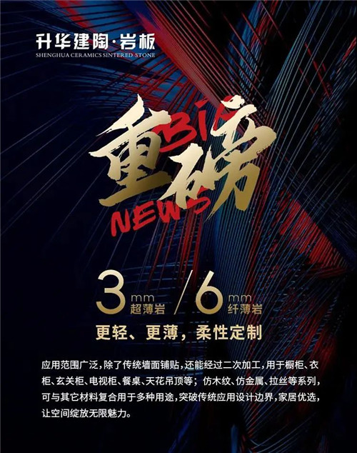 据悉,升华建陶岩板将携最新子品牌——健圣岩板以及仿木纹、仿金属、拉丝等多种全新工艺产品,用品牌的实力、口碑以及产品向公众展示升华建陶岩板“打造岩板行业健康岩板品牌”的发展重心,以全方位、多层次的立体展示为家居行业提供新思路,开拓新渠道。