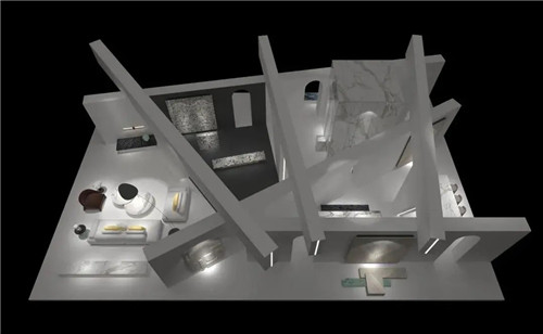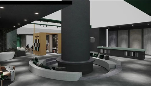 此次展会,欧文莱精品岩板馆以“时间空间站”为主题,空间设计以材质为概念原点,通过建筑几何体块型的空间交错连接,展现附着于建筑形体上的材质之美。展馆的设计延续了欧文莱企业的高级灰IP调性,为观众营造安静、舒适的观赏环境;并通过在色彩的结构与碰撞,营造出100%氛围感,渲染出时尚优雅的现代气质。