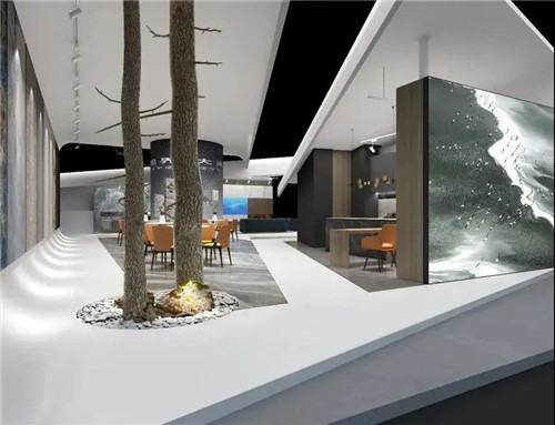 此次展会,LAMINAM岩板以“一些关于岩板的风景”为设计主,展馆空间是由两个岩板柱廊围合而成的一个艺术中庭。其中,艺术中庭依托中央柱子和显示屏,形成一个内聚的空间,显示屏中的动画以日本艺术家宫岛达男的《时间瀑布》为灵感,呈现如瀑布般落下的岩板碎片,地面上则散落一些实体的岩板碎块,在几颗树中间作为一种抽象的神秘的存在。“一些关于岩板的风景”主题展馆延续了LAMINAM岩板参展上一届广州建博会“岩板森林”主题馆的部分概念,在“人造物与自然”的戏剧性中挖掘全新的表达。
