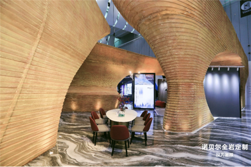此次亮相佛山潭洲陶瓷展,诺贝尔全岩定制•汉为岩板展厅以自然之名创造空间秘境。展馆基于国家地理×诺贝尔两大行业巨擘开展“寻纹记-发现自然之美”联合摄影研究成果,以西岔大峡谷为设计灵感来源,结合戈壁滩风化石风貌,通过将远古洞穴和现代空间产生链接,叙述一段自然佳话。展馆外观粗犷大气,内部分设会客厅、厨房、卫浴等空间,从不同维度展示岩板应用场景。