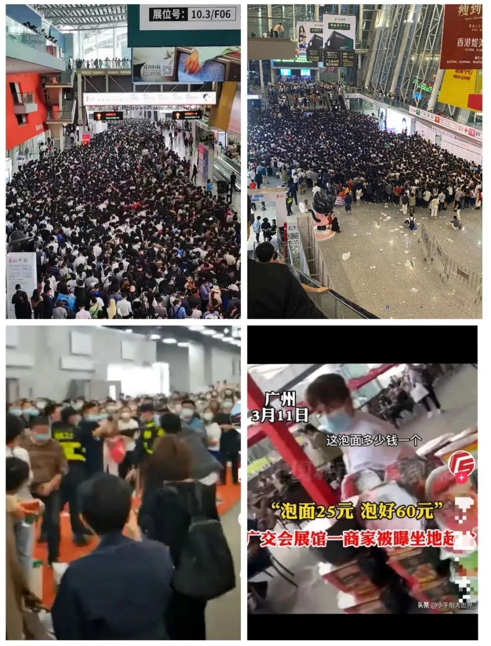 在几万人滞留广交会展馆期间,部分人员试图翻墙逃离,有的商家坐地起价,矿泉水卖到20元/瓶,泡好的泡面卖到60元/碗,还有人在核酸检测排队时发生肢体冲突……