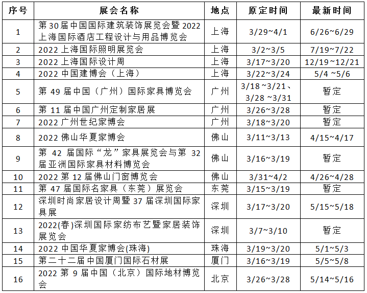 随后,原计划于3月份举办的第49届中国(广州)国际家具博览会、2022中国广州国际家具生产设备及配料展览会、第11届中国广州定制家居展等展会主办方均发布了展会延期通知,具体时间待定。