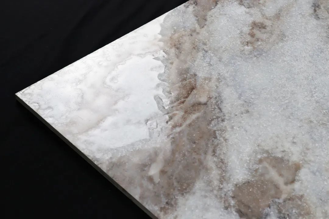 「全抛堆雕工艺」可以根据纹理版面设计,在瓷砖表面的特定位置堆积道氏巨晶、珠光、冰晶等干粒材料,再施加保护釉覆盖,烧成后进行全抛光工艺处理,最终形成局部向瓷砖表面外微微隆起的立体效果。