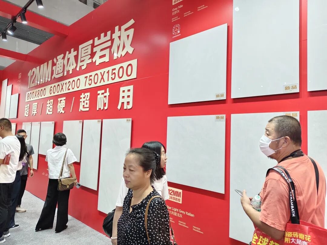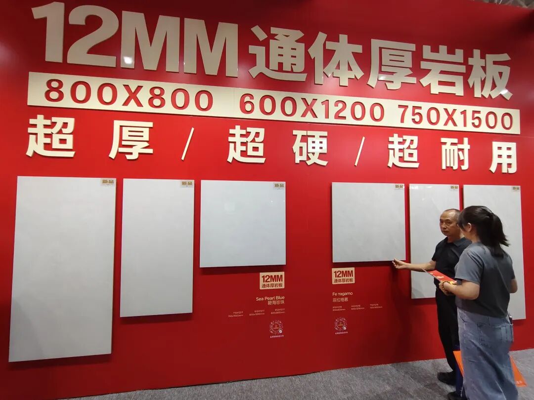 金满堂携三代同堂系列重磅亮相,该系列主打12mm“超厚 超平 超耐用”;还有12mm通体厚岩板,该产品包括800×800mm、600×1200mm、750×1500mm等规格,产品颜色与规格多样化。