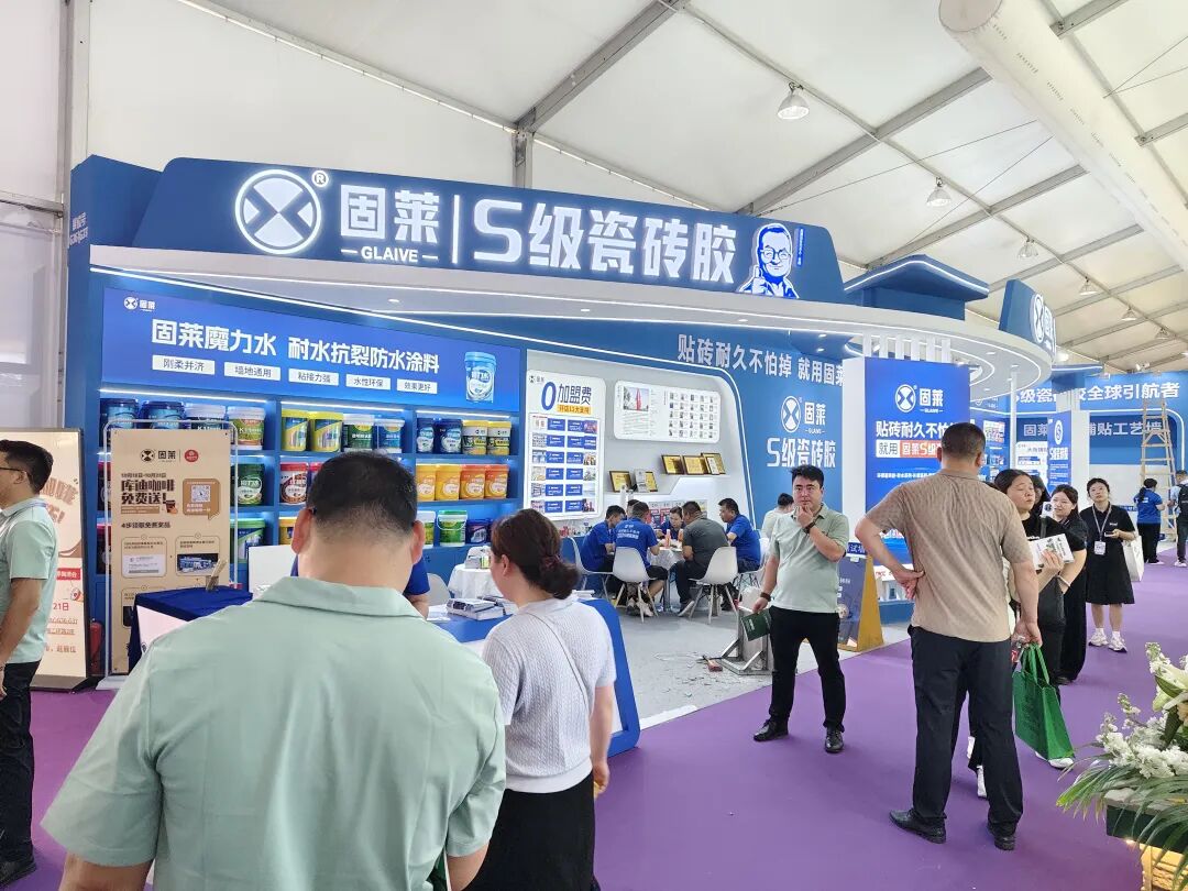 辅材展示区,聚集了唐姆、亿固、贴得稳、固莱、粤贴稳、千大大、涂小二、好霸等品牌,带来了瓷砖胶、防水剂、展架、胶粘剂、辅料等各类产品,展示不同辅材产品在瓷砖铺贴、装饰施工等领域中的创新应用与解决方案。
