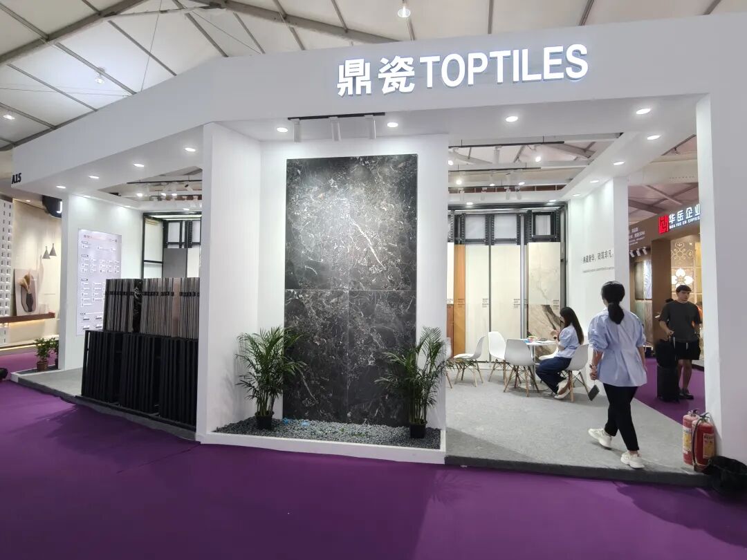 鼎瓷致力于研发质感类产品,其工艺包含金丝绒、浮雕、3D数码模具、超细砂干粒、晶钻面、自然面、胶水定位干粒、胶水糖果半抛等等近20种,此次重点展示了胶水定位干粒新品。
