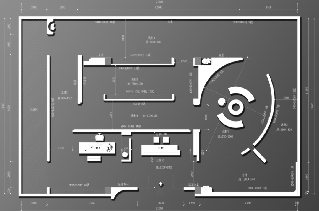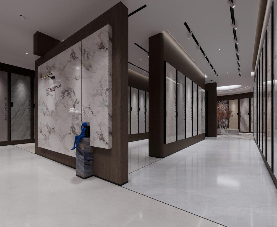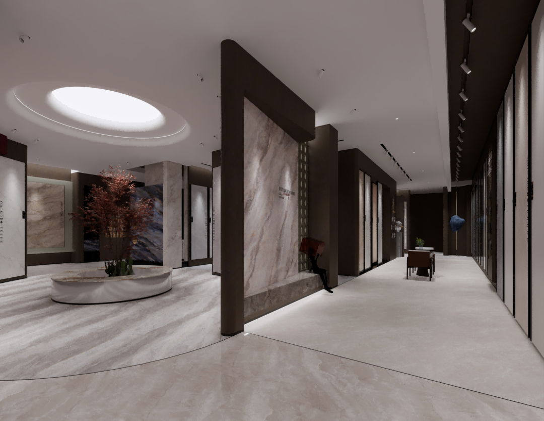 步入空间,映入眼帘的是强辉精工瓷砖金属质感的LOGO,在岩板背景墙衬托下熠熠生辉,地面纹理如自然脉络般舒展,营造出浑然天成的视觉韵律。