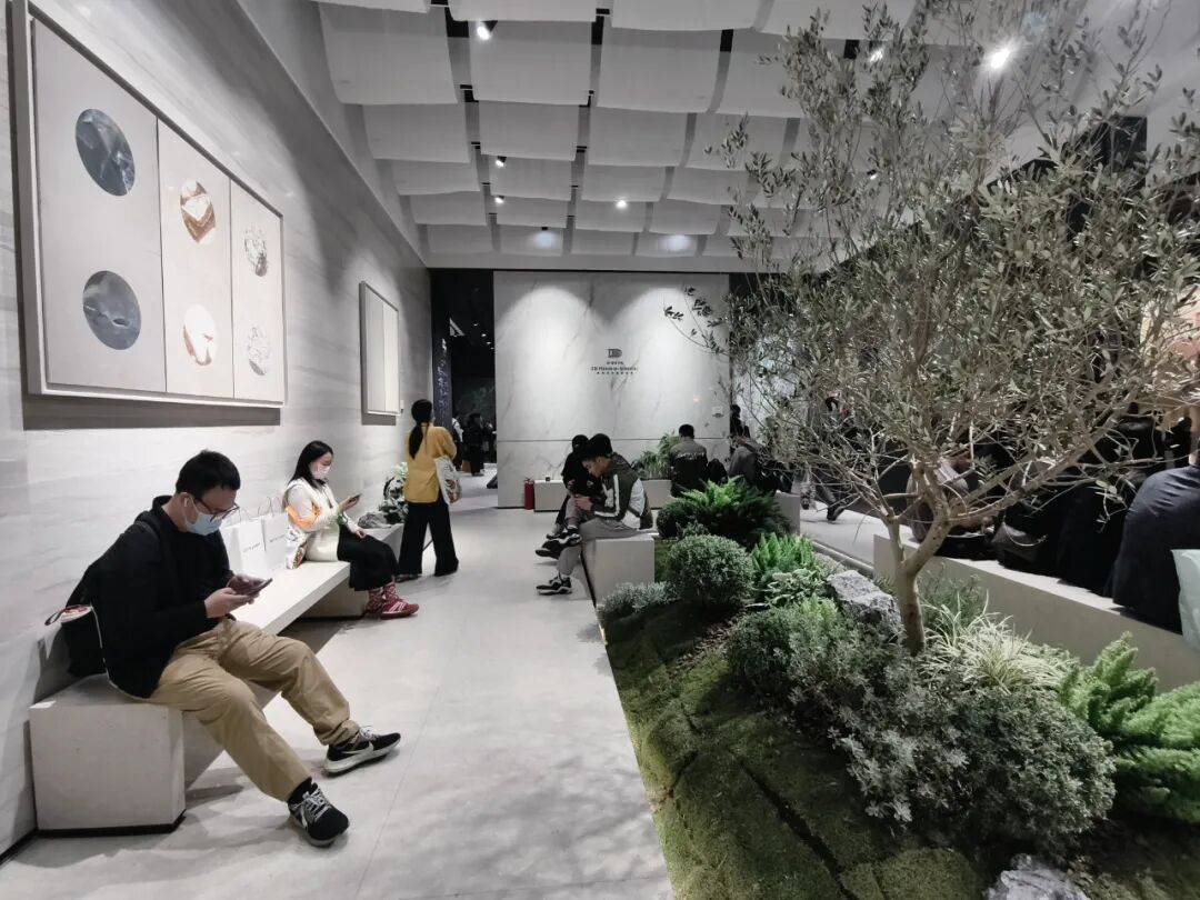 现场,宏宇重点展出了“星链计划”的产品——星钻IV代、星绣、星纹以及瑰丽石系列等,展现高端人居生活场景。展位亮点是,宏宇以 “家居场景化”为核心——把瓷砖展品融入客厅、休闲区等真实空间,搭配樱花树、绿植等柔美元素,让“星际质感”落地为可触摸的生活场景,既展示了产品的应用效果,也弱化了商业展陈的生硬感。