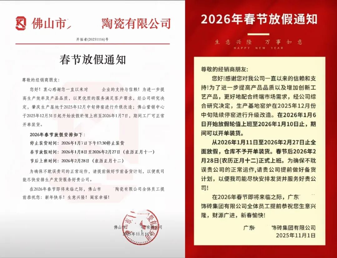 与往年一样,2025年末已经有多家陶企发布了停窑放假通知,提前告知经销商做好备货准备。然而与往年不同的是,由于2026年春节比2025年晚,陶企停产时间虽然与往年类似,但复产时间或将相应推迟。