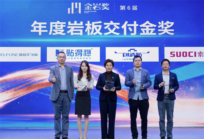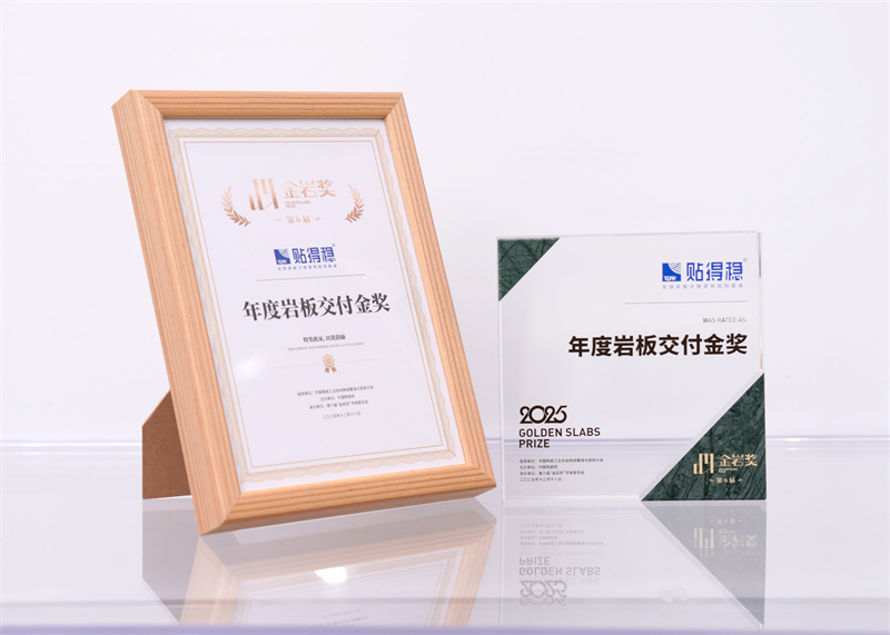 2025年12月18日,在佛山举行的2025中国岩板思想大会暨第六届“金岩奖”颁奖典礼上,贴得稳凭借其创新的交付体系和卓越的服务能力,一举夺得“金岩奖·年度岩板交付金奖”。这一荣誉不仅是对贴得稳年度成就的肯定,更是对其推动行业从“卖产品”向提供整体解决方案转型的高度认可。