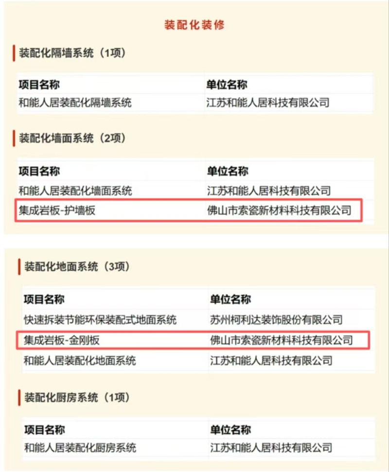 值得一提的是,索瓷的创新实力已获得国家级政策层面的高度认可。2025年底,其“集成岩板”系列产品成功入选住建部发布的《面向“好房子”建设的“好材料”选用指南(2025)》,成为全国首批被官方推荐用于“好房子”建设的陶瓷类部品。同时,该产品亦被列入《江苏省改善型住宅重点推广应用新产品》推荐名单,打破以往“头部企业垄断政策资源”的格局,印证了《报告》提及的“细分创新”在“好房子”时代产业政策中的潜力。