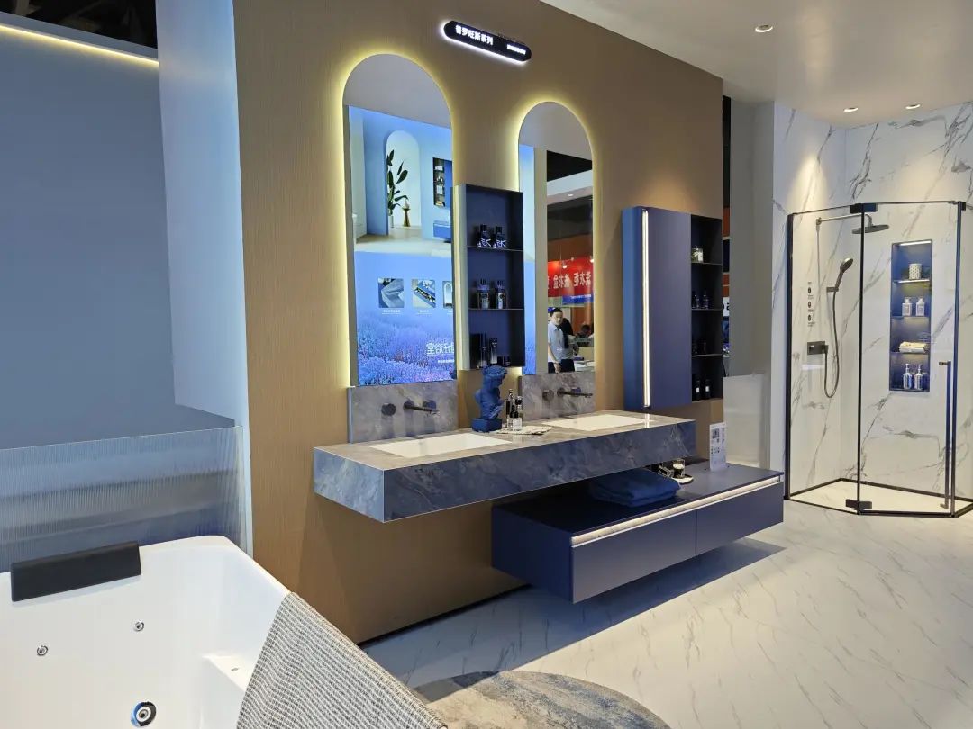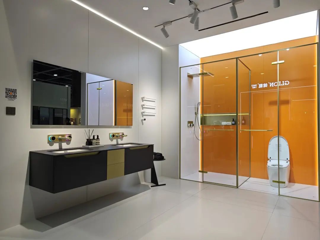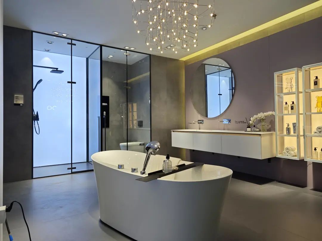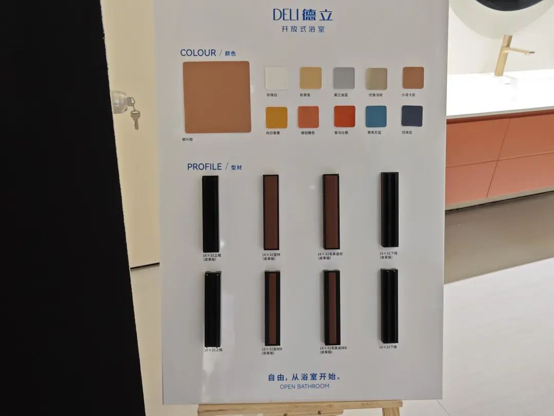 德立主力展品为客制化选项丰富的开放式浴室,其中浴室柜有10多种颜色可选。