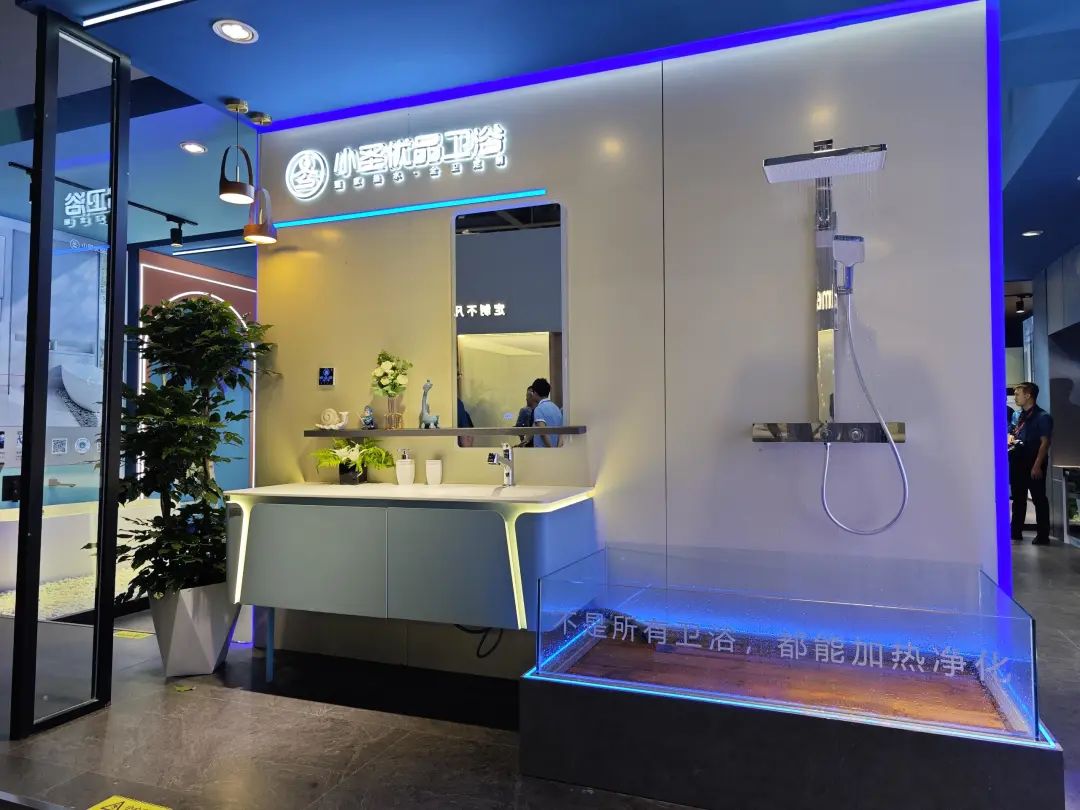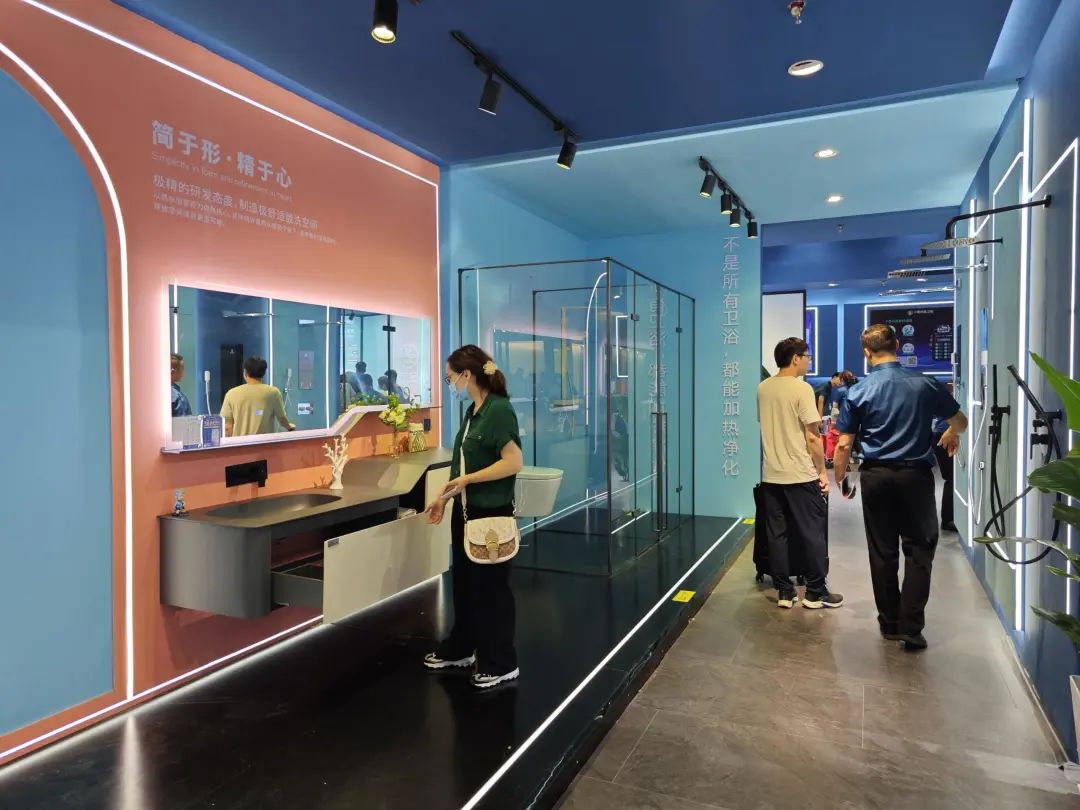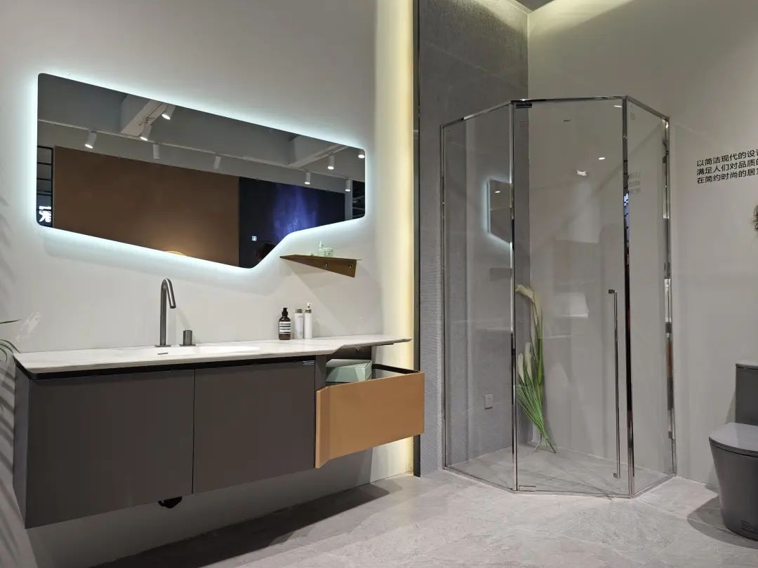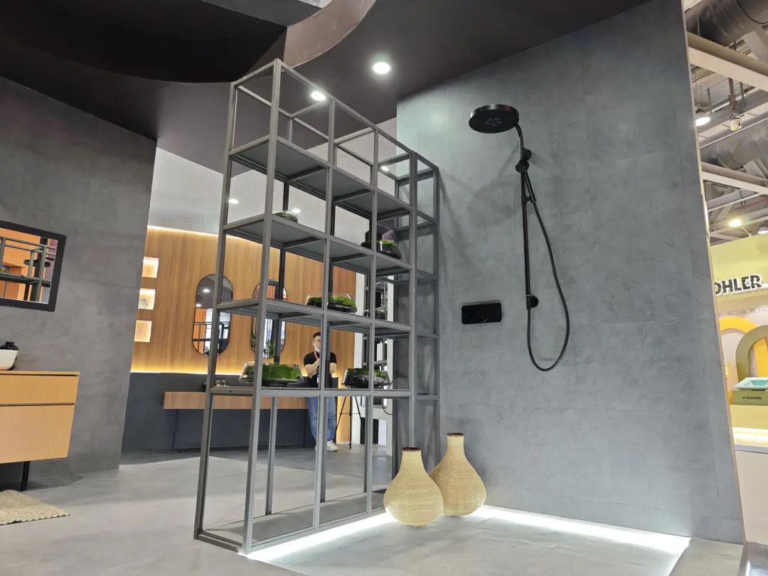 德立主力展品为客制化选项丰富的开放式浴室,其中浴室柜有10多种颜色可选。