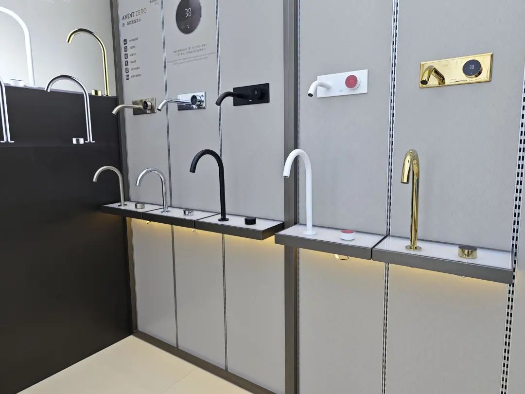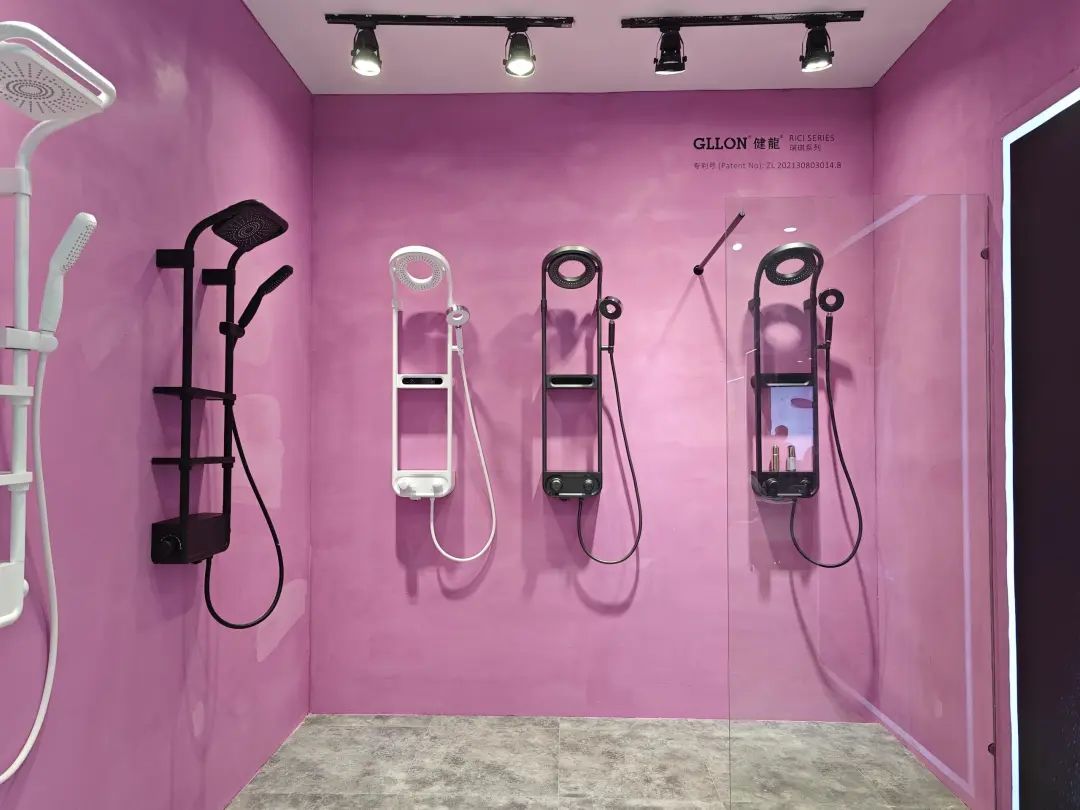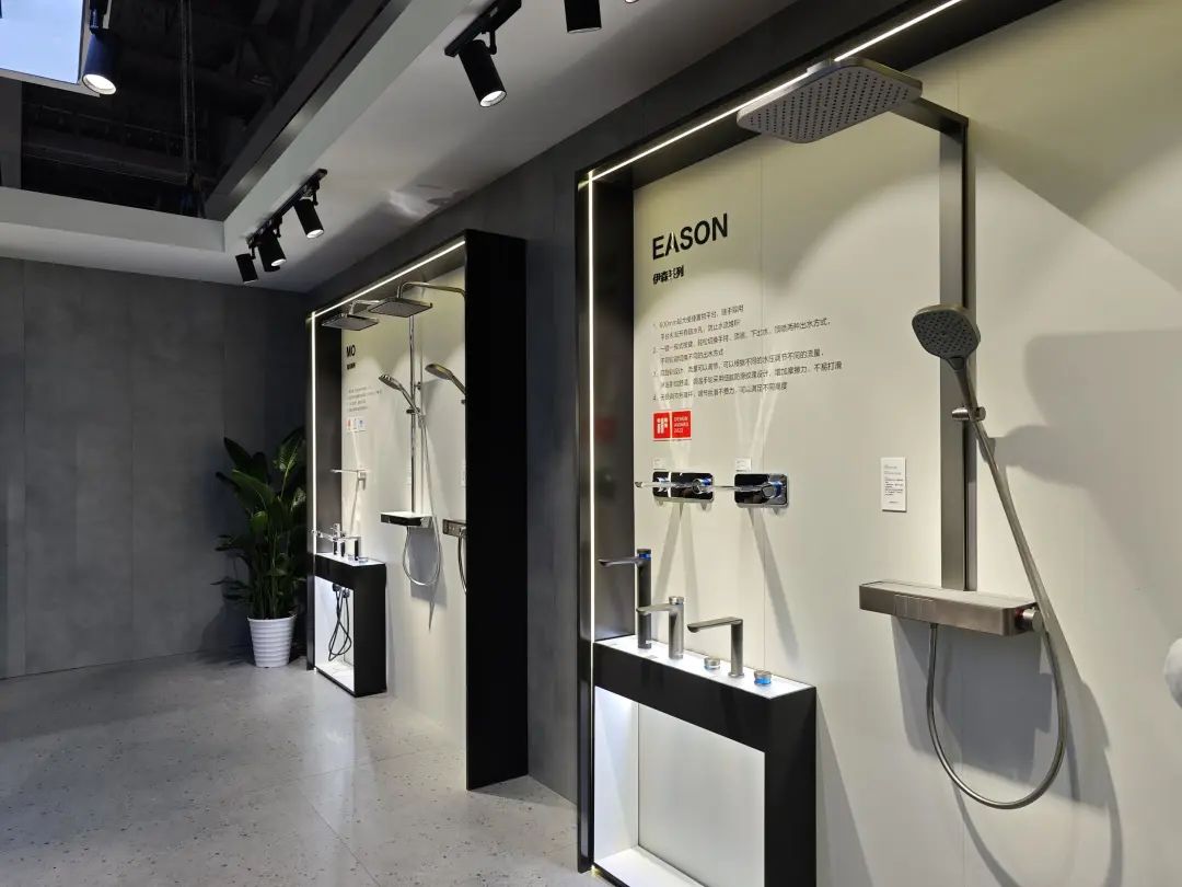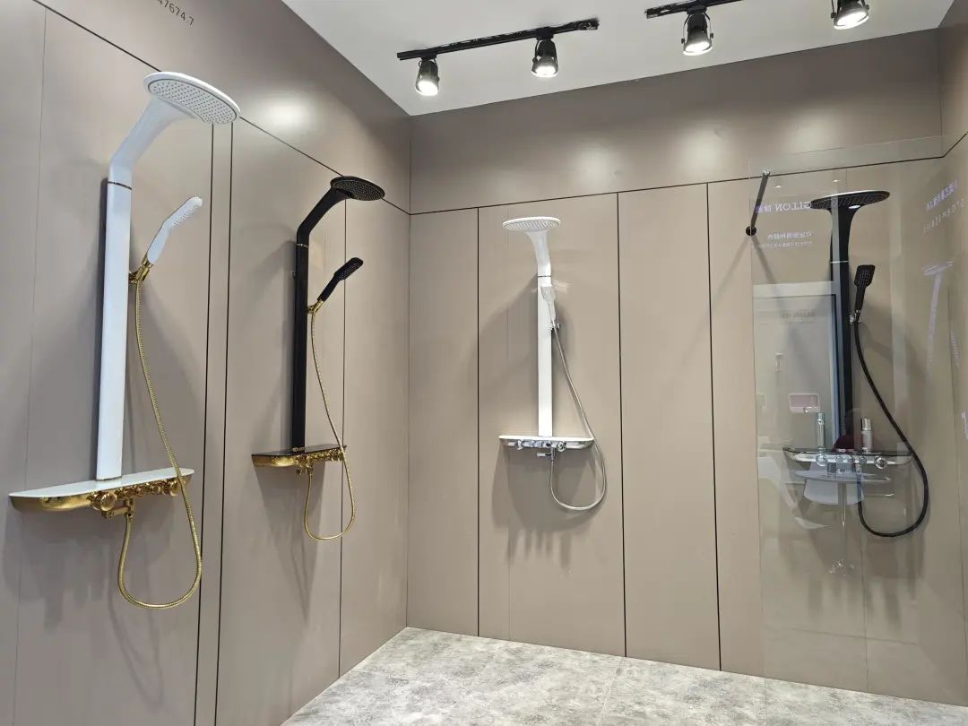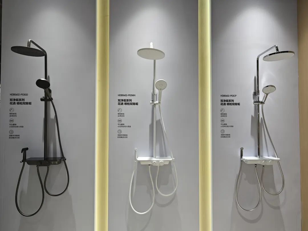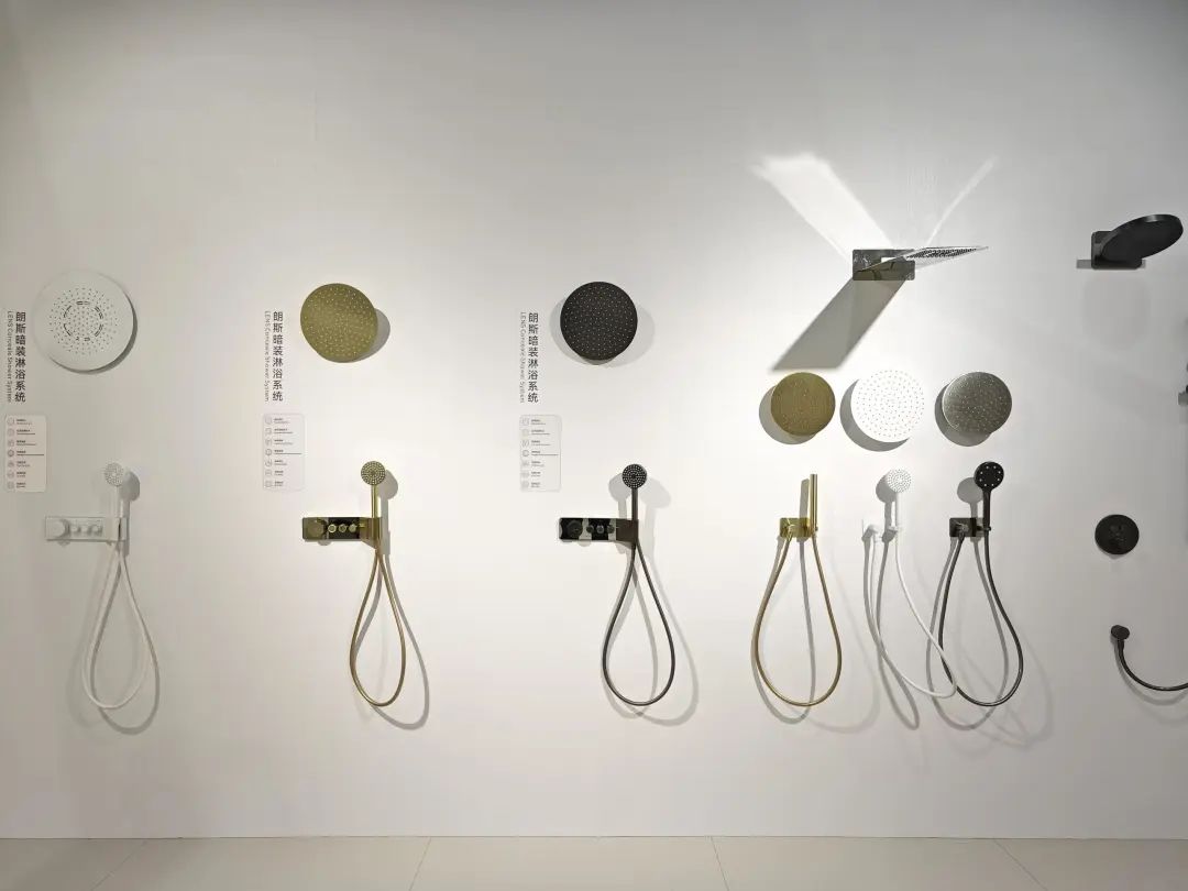 展品以淋浴花洒为主,主力产品为安装淋浴系统,多款产品都有黑、白、金等数种饰面。