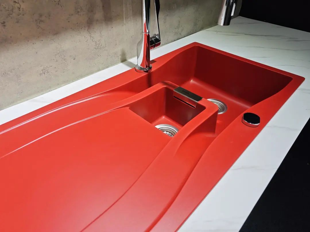 朗司的多款产品无论表面和造型都设计独特,一款双人用浴室柜以抬脚延伸出置物架,功能性十足。