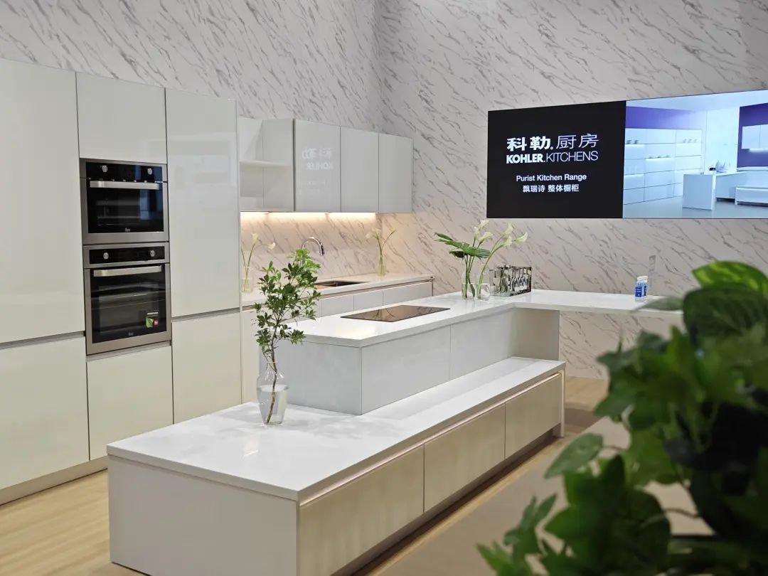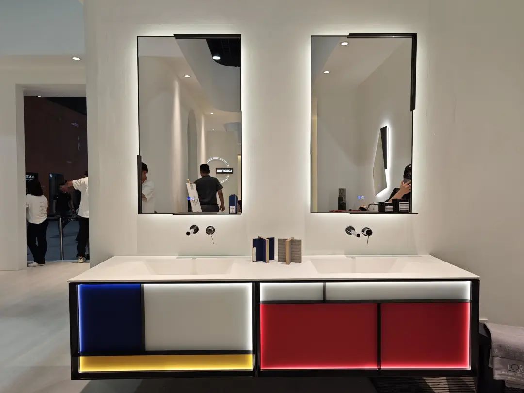 科勒的布展基本延续上海厨卫展,设置了一面彩色卫浴墙、NUMI2.0智能马桶展示区、水龙头及面盆展示区、飘瑞诗整体橱柜展示区等。