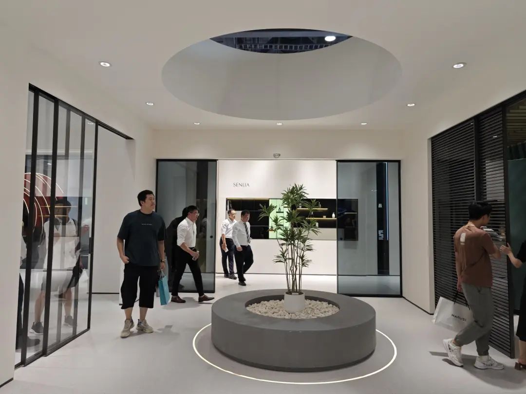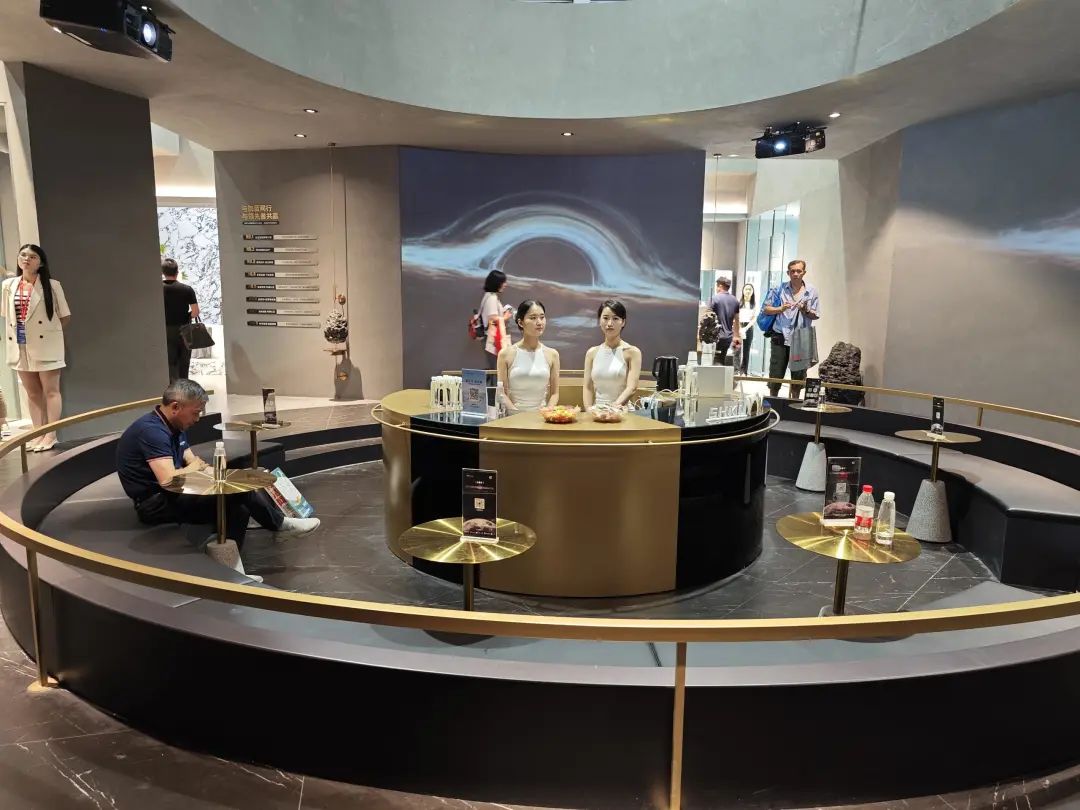 心海伽蓝展台内外都富有特色,中间设置了下沉的休息区,四周则是各式展品。主要展示了望月系列、星蕴系列、茗赫系列、潮汐系列、匠作系列等新品。
