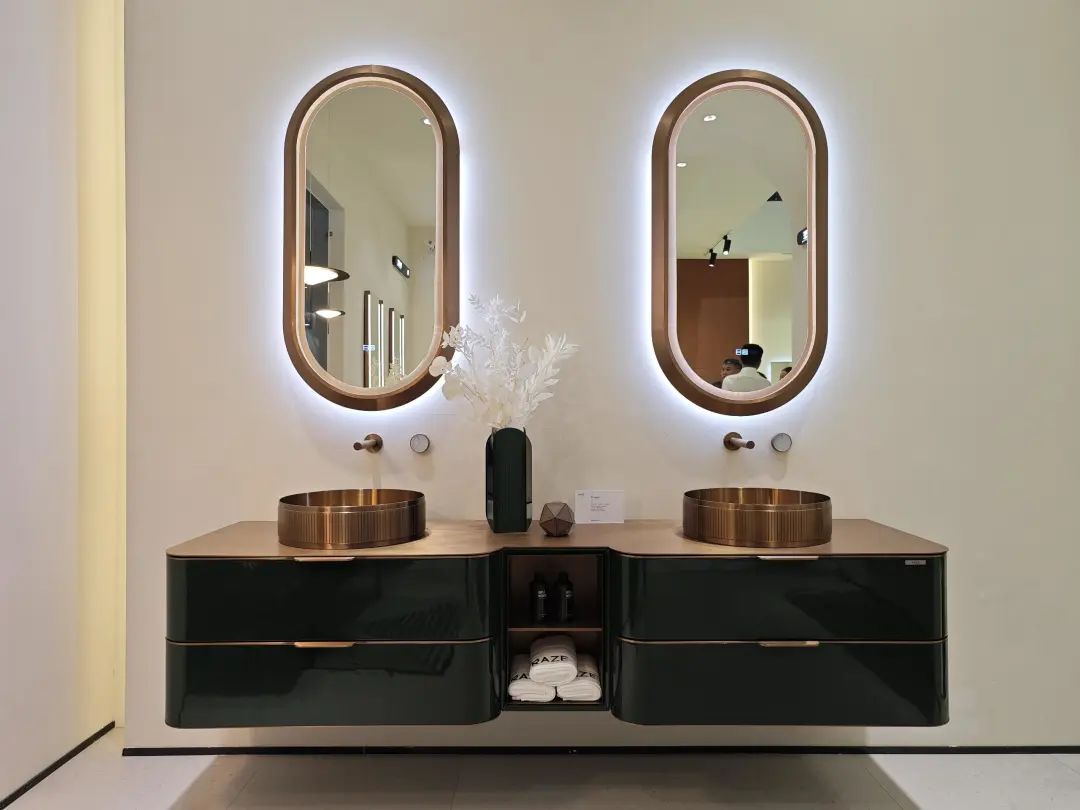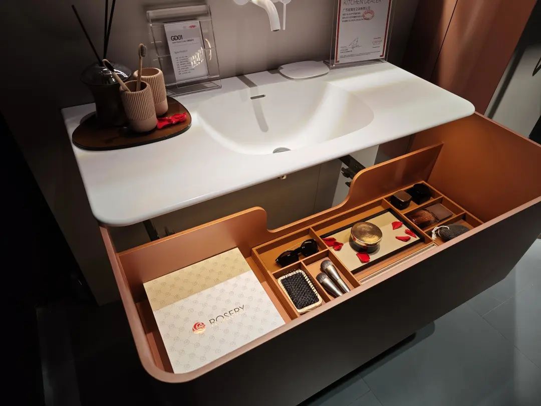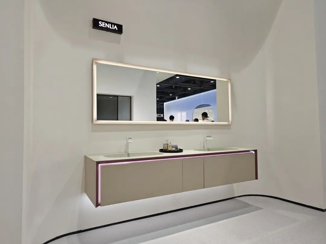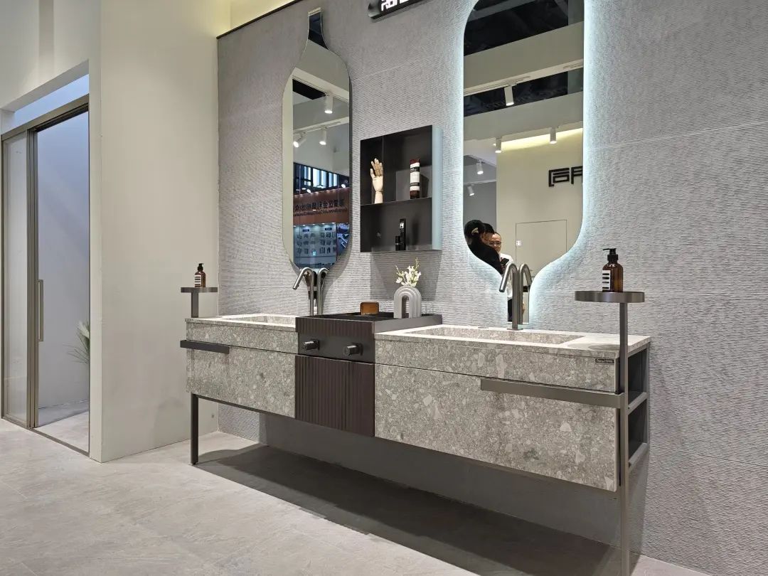 普瑞凡主推“高定浴室柜”,带来了一系列浴室柜新品,其中一款采用分体式断层设计,显得优雅大气。