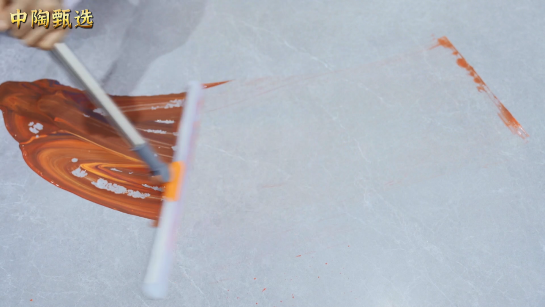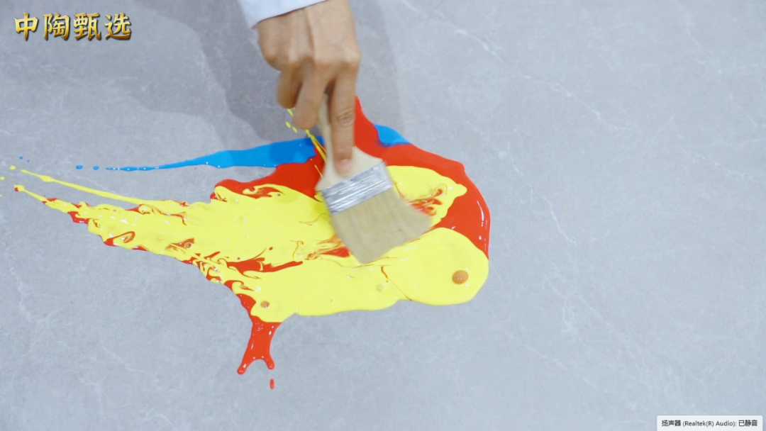 为测试质感大师的防污性和易清洁功能,我们将水粉颜料直接用力甩在砖面上,再用画笔涂抹均匀,静置半个小时。接下来,只要洒水沾湿,用魔术扫把一刮,污渍马上消失得无影无踪