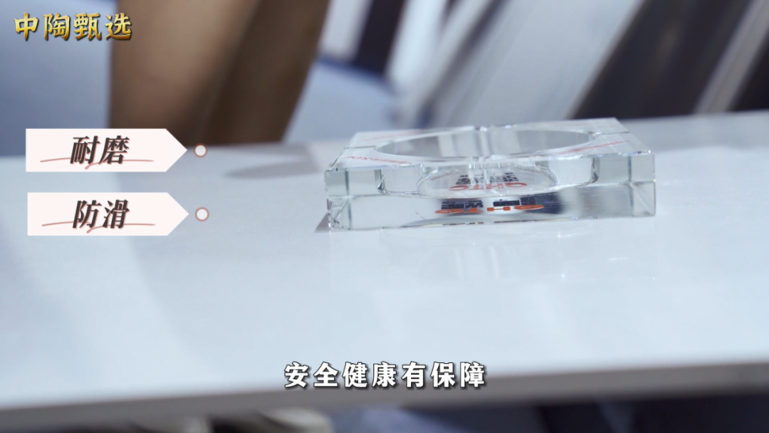 在防滑性能上,质感大师表面形成致密单晶体结构,该结构使瓷砖吸附能力大大提升,遇水更防滑。我们用平整光滑的烟灰缸测试倾斜砖面的下滑效果,发现烟灰缸下滑到一定位置就稳稳吸附在砖面上,防滑性能相当出色。