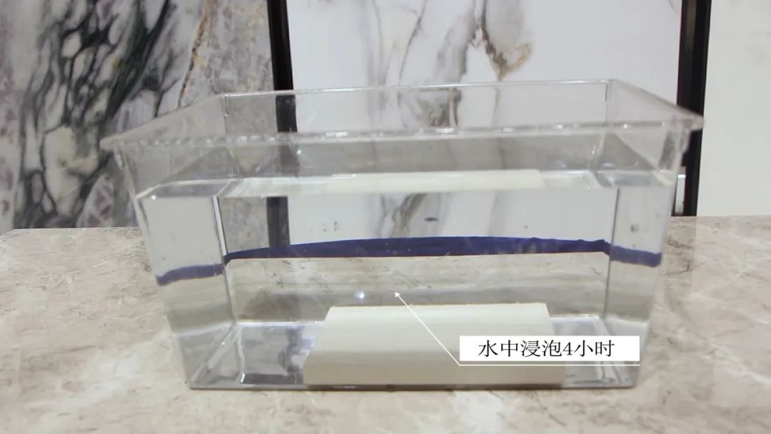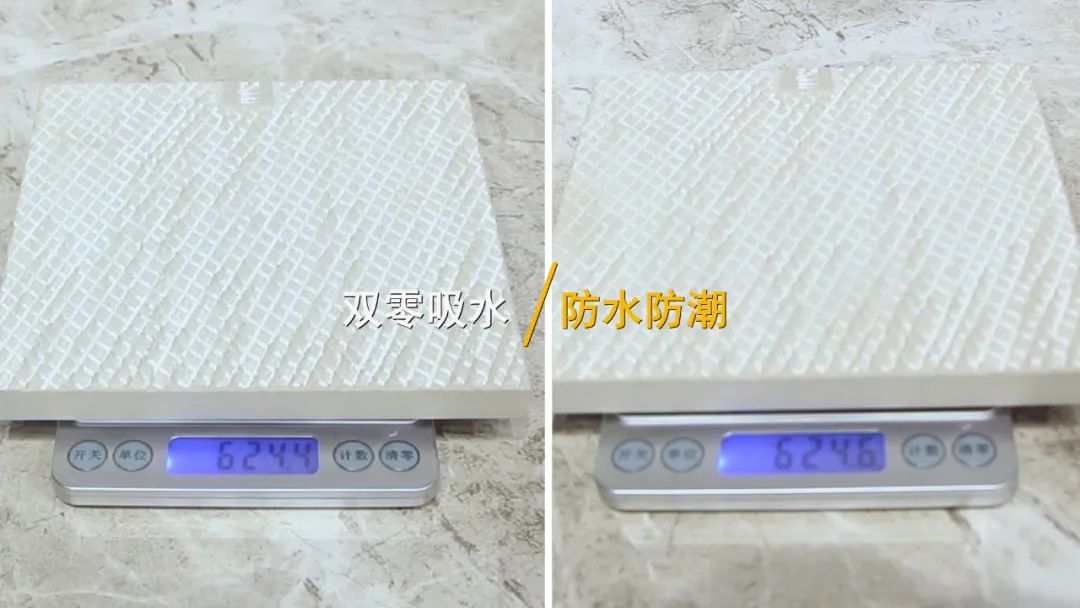 从产品基础来说,密缝铺贴对瓷砖的质量要求非常高。除了平整度要高,瓷砖的吸水率一定要足够低。为了测试简一云朵灰的吸水率,测评小组将同款瓷砖样品先称量,记录数据,再放入小桶中完全浸泡4个小时后,拿出擦干表面残留水分称量,记录浸泡后的样品重量。对比数据得知,瓷砖样品泡水前后的重量几乎没有变化,真正达到了双零吸水率。