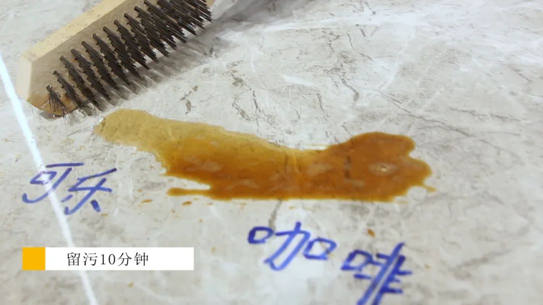 得益于吸水率低和瓷砖表面平整光亮的特性,简一云朵灰拥有极强的防污抗渗透性能。测评小组在简一云朵灰表面制造可乐、咖啡和白板笔字迹等日常生活中常见的污渍,再用锋利的钢刷用力刮磨瓷砖表面。静置10分钟后,用润湿的抹布轻轻一擦,瓷砖表面依旧光洁如新,没有被污渍渗透的痕迹。