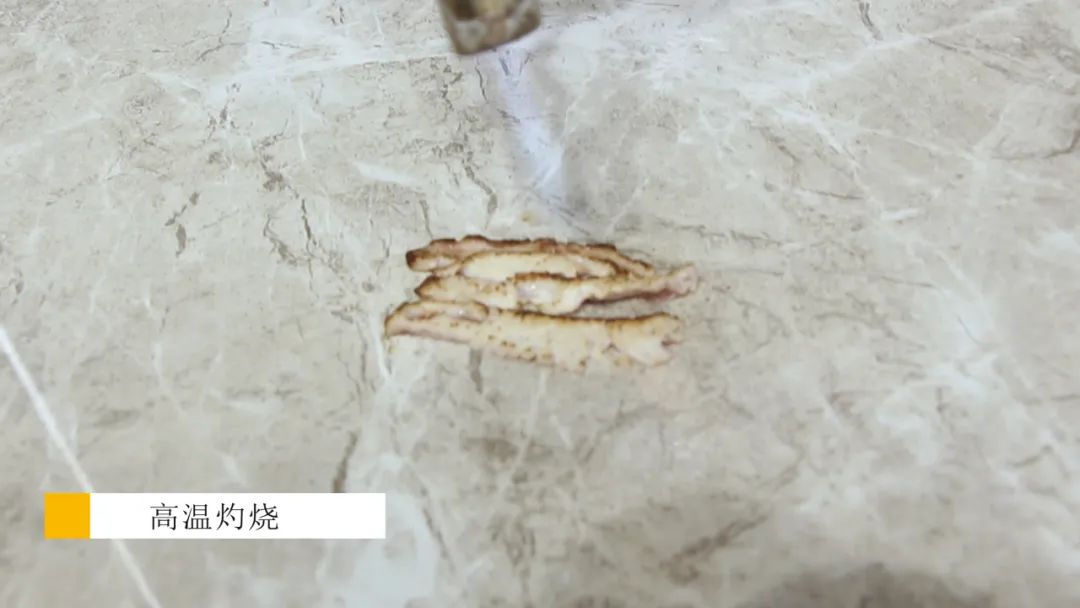 测评小组将肉片放置在简一云朵灰表面,使用高温喷枪在瓷砖表面烤制肉片,几分钟后,肉片已经变色变焦,显然已经熟透。静置片刻后,测评人员将肉片移走,用湿润的抹布擦拭瓷砖表面残留的油渍,观察到砖面依旧非常干净,既没有污渍渗透也不会发出异味。