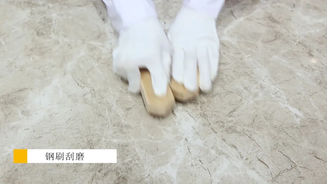 家里地面铺贴瓷砖,最希望的当然耐刮耐磨、持久耐用,不必像木地板一样过了三年五年就得换。那么,简一云朵灰的耐磨性能如何?测评小组用锋利坚硬的钢刷在简一云朵灰表面来回摩擦数十遍后观察其表面,发现砖面完全没有任何划痕,证明其耐磨性能优越,铺贴在客厅地面不受磨损,长久如新。