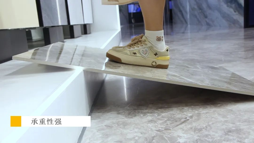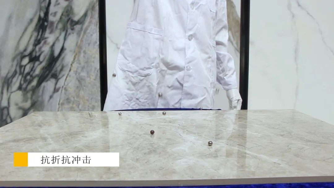 简一云朵灰的标准厚度为9~12mm,砖面硬度极高,具有较强的抗折和抗冲击性能。测评小组走上倾斜悬空的简一云朵灰表面,上下摇晃瓷砖稳如泰山,没有丝毫断裂迹象。此外,使用小钢珠从离地面1米高的位置掉落,简一云朵灰表面也没有出现崩角碎裂的情况。这表明简一云朵灰承重性强,非常抗折抗冲击,在日常生活中有重物、尖锐物体摔落,也不会有丝毫损伤。