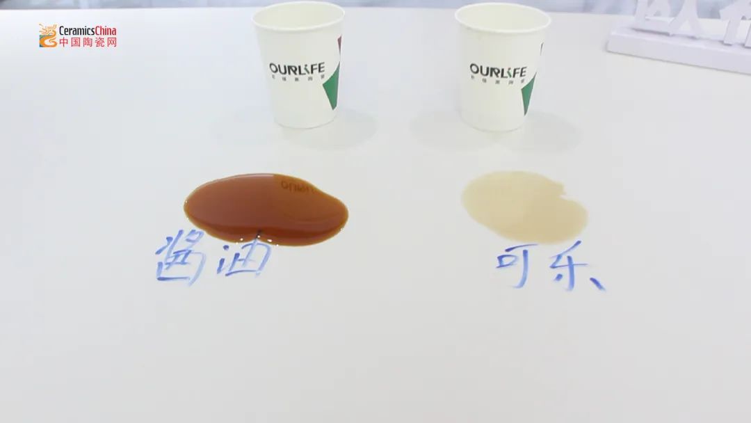 超低的吸水率说明欧福莱岩板瓷砖高度致密,这也意味着普通污渍根本无法渗透其表面,同时不会滋生细菌。测评人员在产品表面分别倒上可乐和酱油,并用水彩笔写字标注,静置几分钟后,用润湿的抹布轻轻一擦,所有污渍全部都可擦去,产品表面依旧光洁如新。