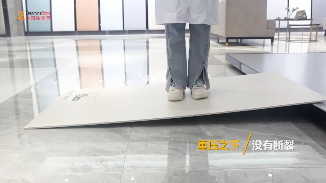 欧福莱岩板瓷砖的厚度为9mm,相较于普通瓷砖的10-12mm较薄了些,但是其抗折性能依旧强大。测评人员站上倾斜的产品表面,随后上下摇晃,产品也没有出现断裂的现象,说明其承重能力相当强大