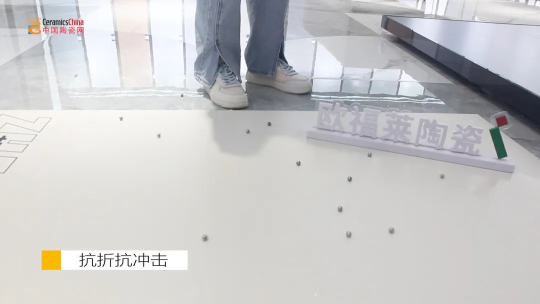 生活中经常会遇到重物掉落地面的情况,例如玻璃杯、陶瓷碗等,这种情况考验的就是地面的抗冲击性能。欧福莱岩板瓷砖硬度高,具有很强的抗冲击性。为了测试其抗冲击性能,测评人员将一把小钢珠从离地面1米高的位置掉落产品表面,并重复多次,随后观察其表面。发现产品表面没有出现崩角碎裂的情况
